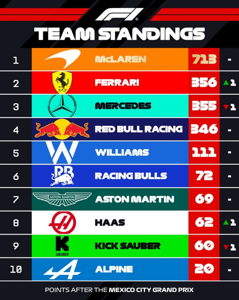 Після етапу в Мексиці загострилася ситуація в Кубку конструкторів. Звісно, сам трофей вже знайшов свого власника, але за друге місце ведуть боротьбу одразу 3 команди і розділяє їх всього 10 очок.