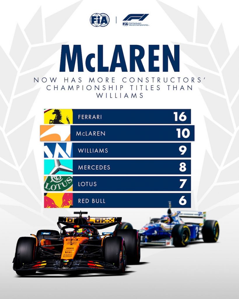 Перш за все, варто сказати, що для Макларен Кубок Конструкторів-2025 став другим поспіль і десятим в історії. За цим показником команда Зака Брауна обійшла Вільямс (9) і одноосібно вийшла на друге місце, поступаючись тільки Феррарі (16).