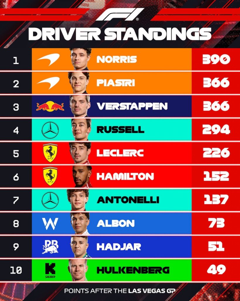 Гонку у Вегасі варто розглядати через призму її головного підсумку. Ландо Норріс та Оскар Піастрі були дискваліфіковані через надмірне стирання направляючої пластини на днищі болідів. Таким чином, перемога дозволила Максу Ферстаппену наздогнати в загальному заліку австралійця та наблизитись до британця на відстань менше однієї перемоги (24 очки).